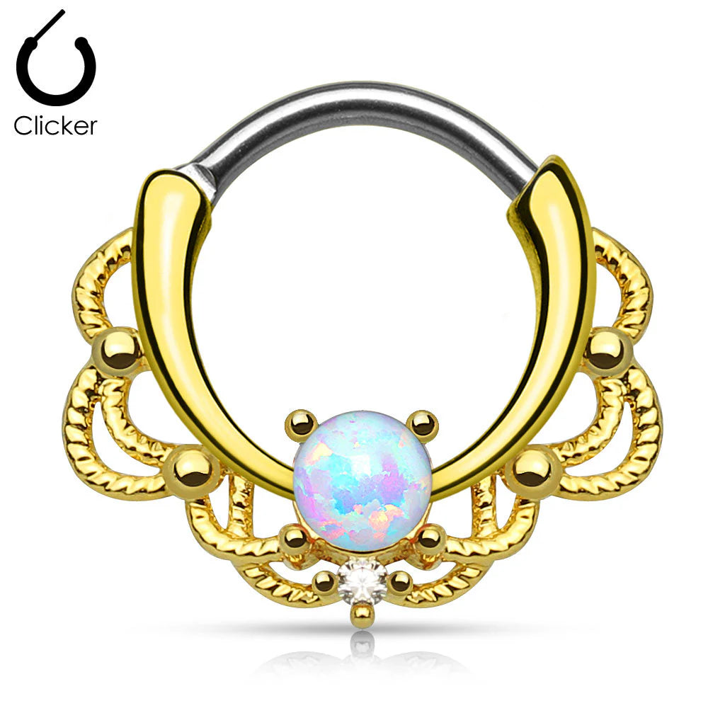 16 GAUGE OPAL SEPTUM RINGMaterial: 316L Surgical Steel/BrassPlating: 14Kt. Gold PlateStone Material: Synthetic OpalThickness: 1.2MM (16 Gauge)Length: 10MMClicker closure