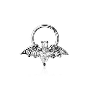 Elevate your piercings with our Crystal Bat Hinged Closed Hoop. Made from high-quality surgical steel and alloy, this hoop is perfect for those with sensitive skin. Measuring 8mm in length and 16 gauge in thickness, it's suitable for a variety of piercings including septum, daith, helix and more.