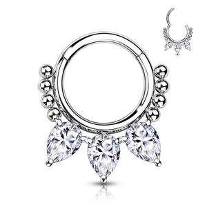 High Quality Precision All 316L Surgical Steel Hinged Segment Hoop Ring with 3 Prong Set Pear CZ and beadsFeatures & Details:Material: 316L Surgical SteelPlating: PVDStone Material: CZThickness - 16 gauge Length - 8mm