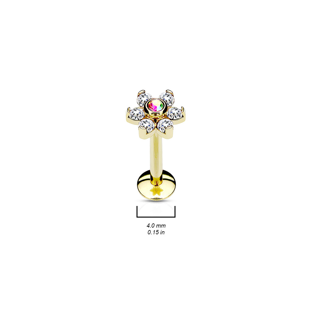 GOLD CRYSTAL FLOWER LABRET WITH AURORA CENTRE- 8MM - 16 GAUGE
