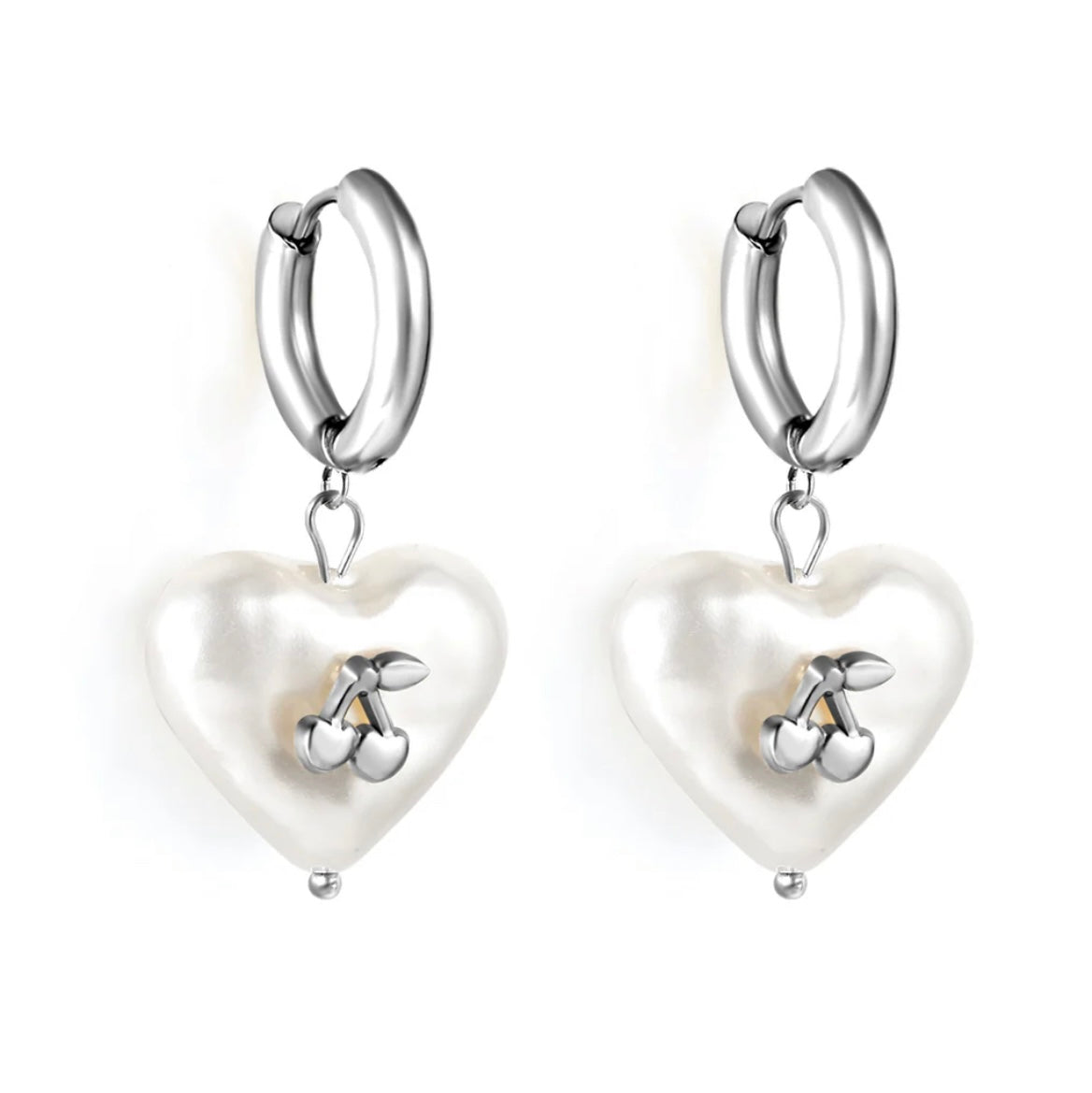 SILVER PEARL LOVE HEART CHERRY CHARM HOOP EARRINGS - 10MM - WATERPROOF
