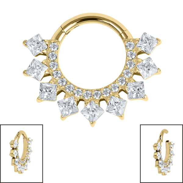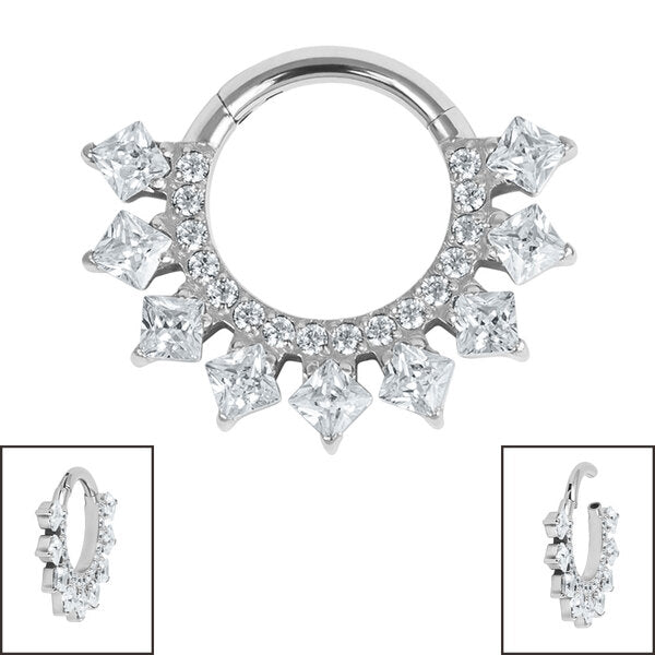 The Verity Princess Jewelled Hinged Clicker Ring, Is beautiful stunning and full of sparkle with its square cut gems surrounding the eternity style ring. It is also easy to use with its hinged opening that clicks shut for a secure closure. In top-quality Titanium, these are great for piercings like Septum, Conch etc. Available in 1.2mm gauge, 8mm